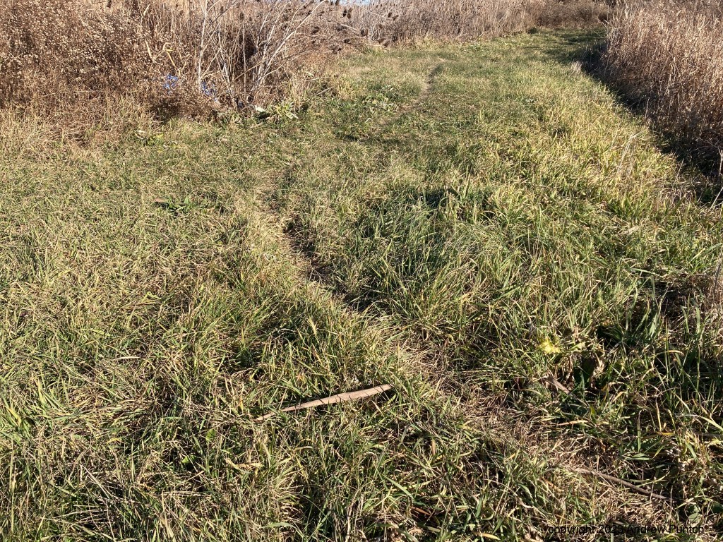 Some critter – am inclined to think either a fox or a raccoon – regularly trods this path. It winds into the middle background and near the top of the photo, veers left into brush.