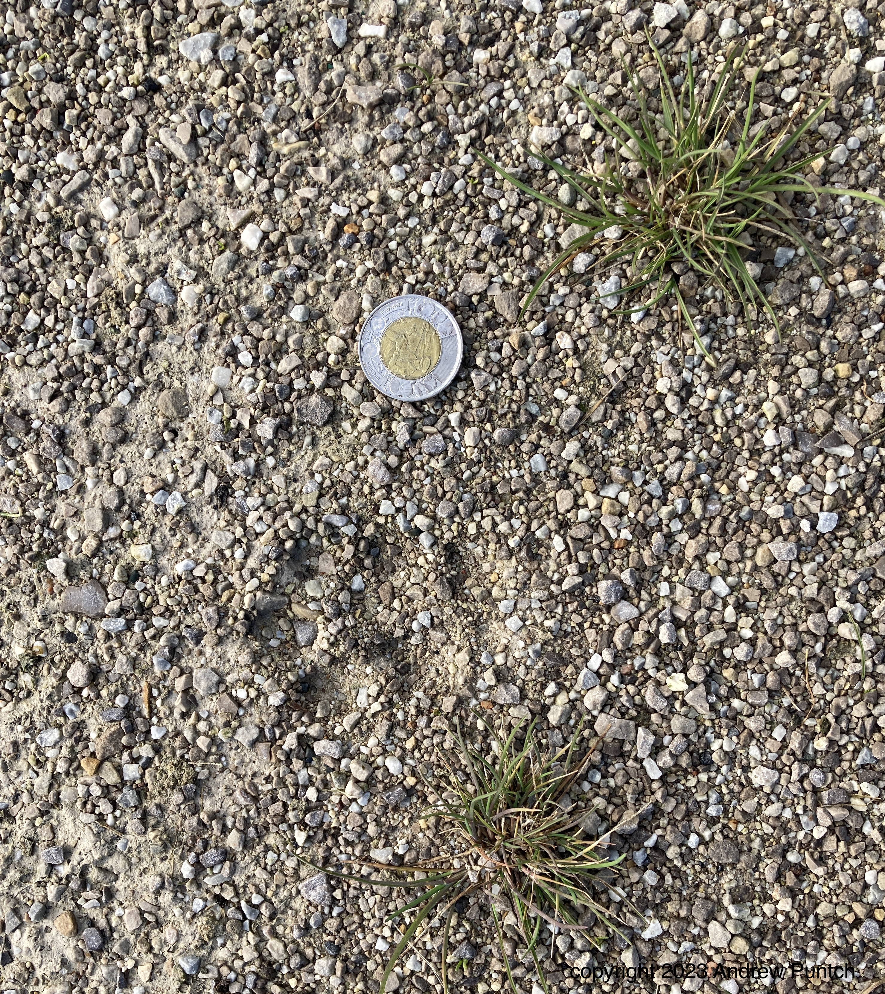 Several animals visit my workplace – raccoon, semi-feral cat, fox. Something likely much larger than any of these paid a visit the other night. The paw print may be a little difficult to discern; it is right in the middle of the image. Perhaps, probably, a coyote or a big dog. For scale, the coin, a Canadian toonie, is about 25mm (1″) in diameter.